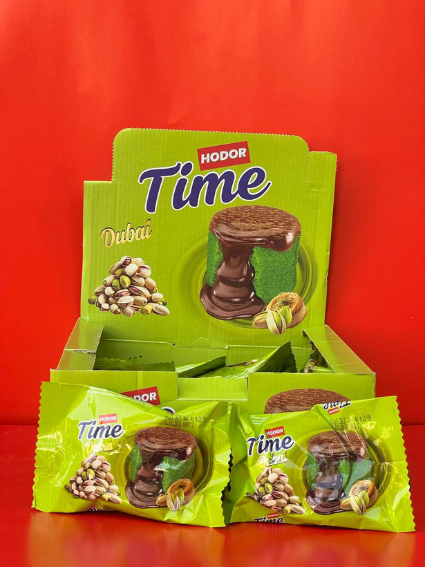 Hodor Time Dubail کیکی نرم و لطیف است که با عطر و طعم پسته تازه ترکیب شده و با یک لایه شکلات مایع و خوش طعم پوشیده شده است. رنگ سبز کیک نشان دهنده استفاده از پسته با کیفیت بالا است. این محصول مناسب مصرف به عنوان میانوعده، دسر یا همراه با چای و قهوه میباشد. بستهبندی جداگانه تضمین تازه ماندن هر قطعه و امکان استفاده آسان در هر زمان را فراهم میکند.