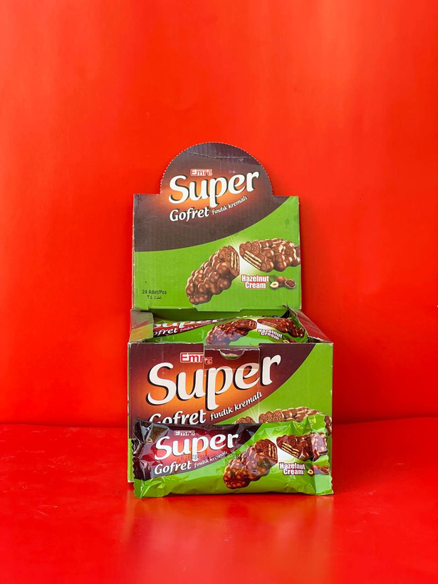 Emre Super Gofret یک ویفر خوشمزه و کرمدار است که در لایههای نازک و ترد ویفر، کرم لطیف و خوشطعم فندق قرار دارد. این محصول پوشش شکلاتی دارد که طعم و ظاهر آن را لذیذتر کرده است. مناسب برای مصرف به عنوان میانوعده یا دسر میباشد. بستهبندی هر عدد به صورت جداگانه باعث حفظ تازگی و سهولت حمل و استفاده میشود.