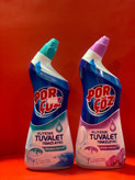 شوینده بهداشتی توالت از برند ترکیهای Por Çöz. نسخه چپ با درپوش فیروزهای «Okyanus Esintisi» (نسیم اقیانوس) و نسخه راست با درپوش بنفش «Orkide Kokusu» (بوی ارکیده) است.