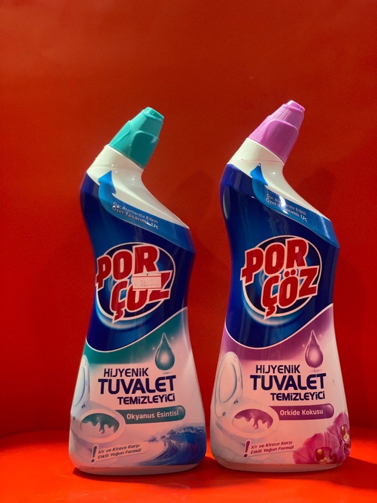 شوینده بهداشتی توالت از برند ترکیهای Por Çöz. نسخه چپ با درپوش فیروزهای «Okyanus Esintisi» (نسیم اقیانوس) و نسخه راست با درپوش بنفش «Orkide Kokusu» (بوی ارکیده) است.